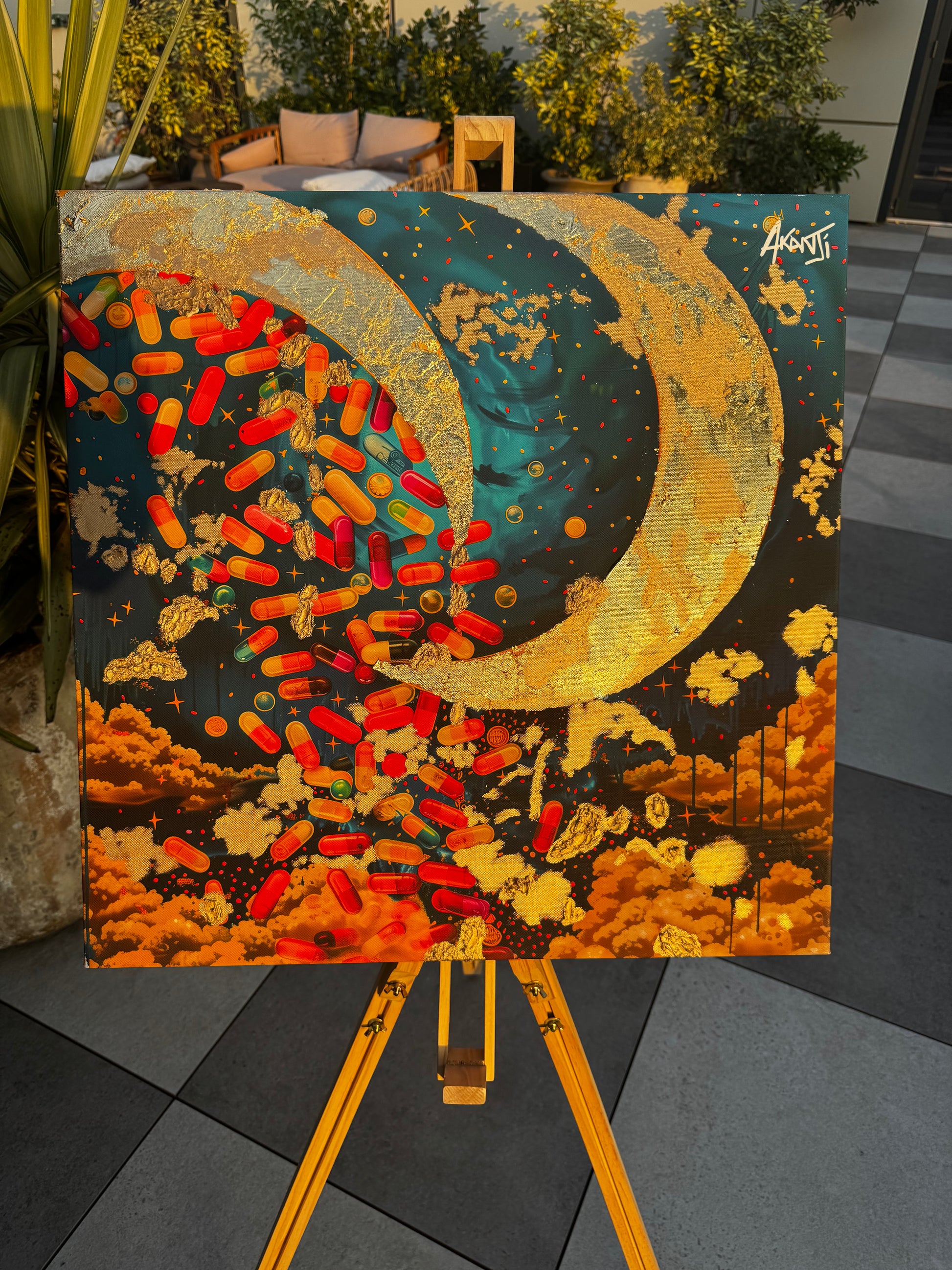 “Numb The Pain” is part of the Moon Crescent Blood collection, created to honour Sickle Cell Awareness Month. This piece translates the invisible struggle of living with sickle cell into a visceral visual language, layers of digital art fused with hand-painted acrylic textures and foiled details that catch the light like resilience breaking through suffering.